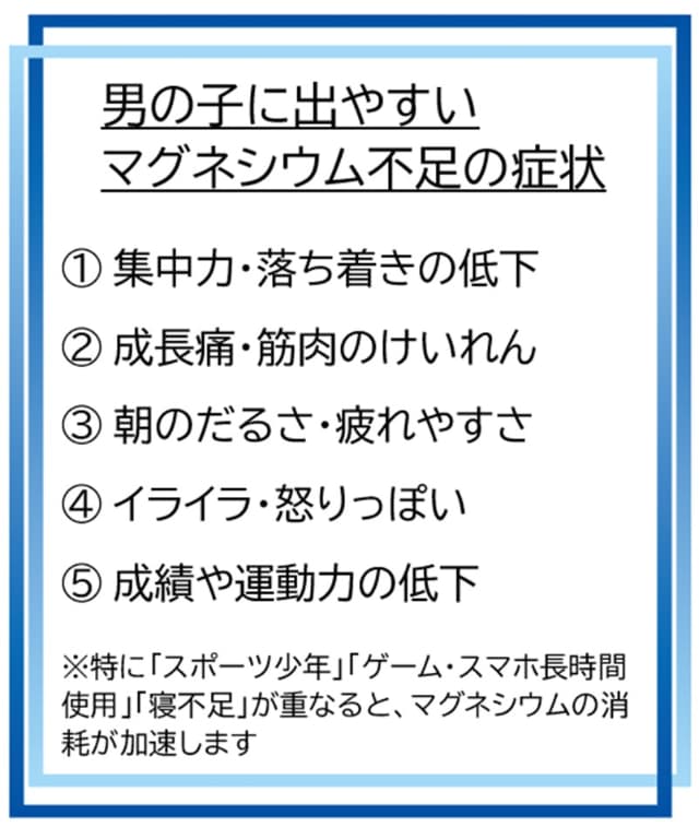 また、成長期の「成長痛」や「骨折の多さ」は、マグネシウム不足が関与している可能性もあります。