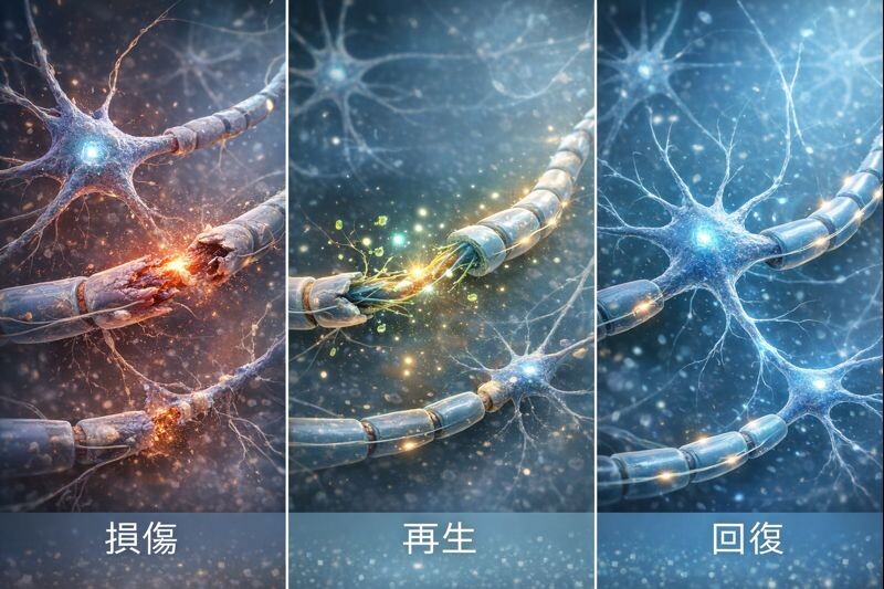 こうした症状は、「神経が傷ついているから起こっている」と単純に考えられがちですが、実際には神経そのものの損傷だけでなく、血流の低下、炎症反応、周囲の筋肉や関節の緊張、自律神経の乱れなど、複数の要因が重なって生じているケースが多いとされています。