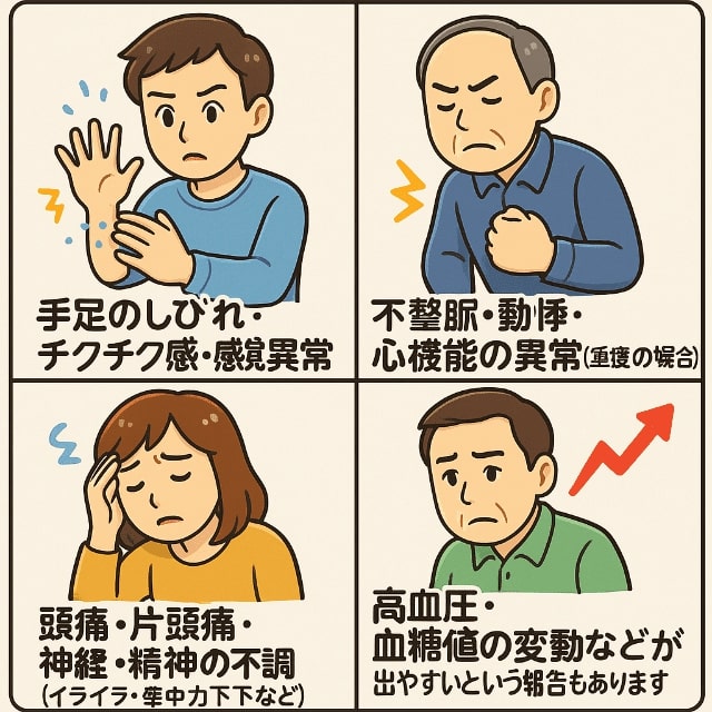 - 血中マグネシウムが少し低めでもすぐ症状が出るとは限らず、初期は自覚しにくいことがあります。