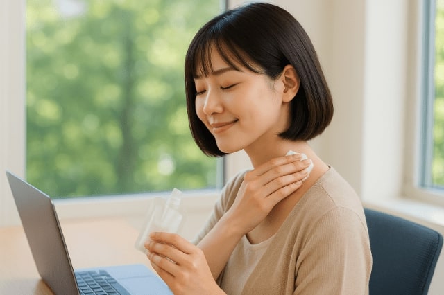 円を描くように1分ほど。肌になじませたら衣類を着用できます。